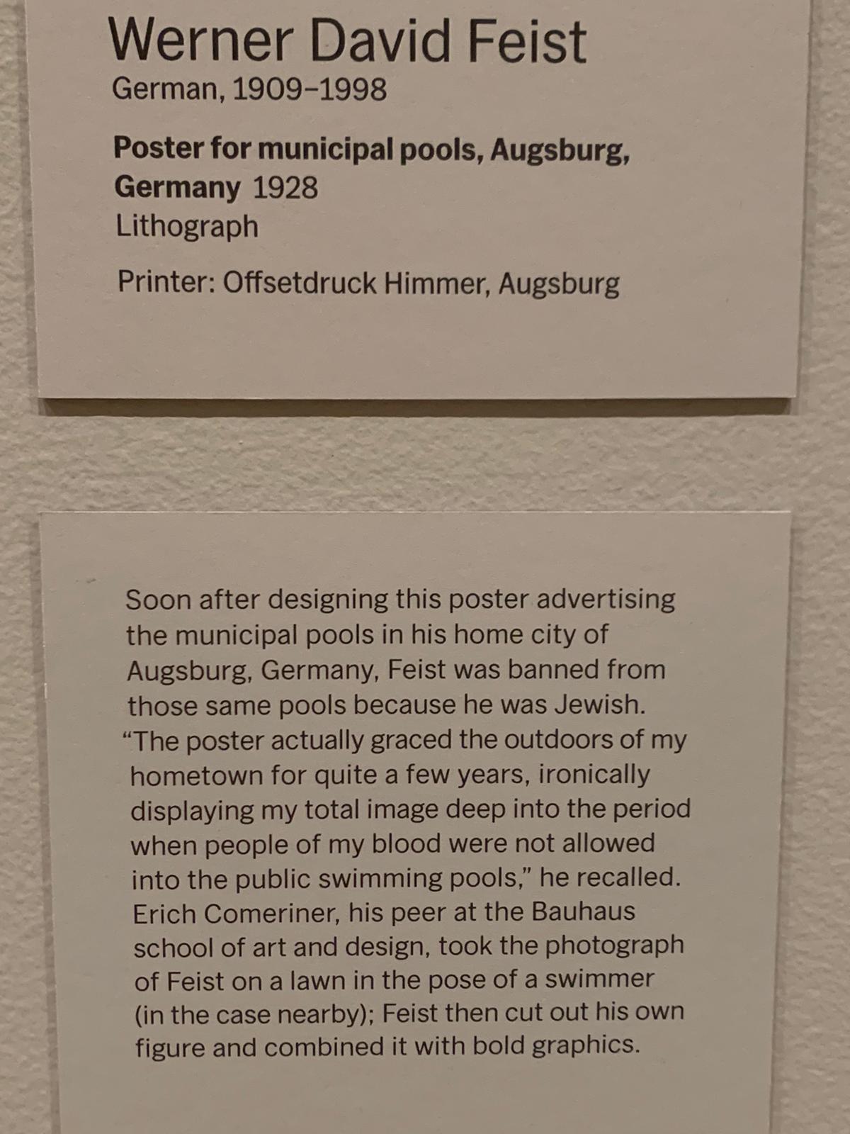 „Kurz nachdem er dieses Plakat für die städtischen Schwimmbäder in seiner Heimatstadt Augsburg entworfen hatte, wurde Feist aus denselben Schwimmbädern verbannt, weil er Jude war. ‚Das Plakat zierte tatsächlich einige Jahre lang die Litfaßsäulen meiner Heimatstadt und zeigte ironischerweise mein Gesamtbild bis tief in die Zeit hinein, als Menschen meines Blutes nicht in die öffentlichen Schwimmbäder durften‘, erinnerte er sich. Erich Comeriner, sein Kollege an der Bauhausschule für Kunst und Design, fotografierte Feist auf einem Rasen in der Pose eines Schwimmers […]; Feist schnitt dann seine eigene Figur aus und kombinierte sie mit kühnen Grafiken.“6