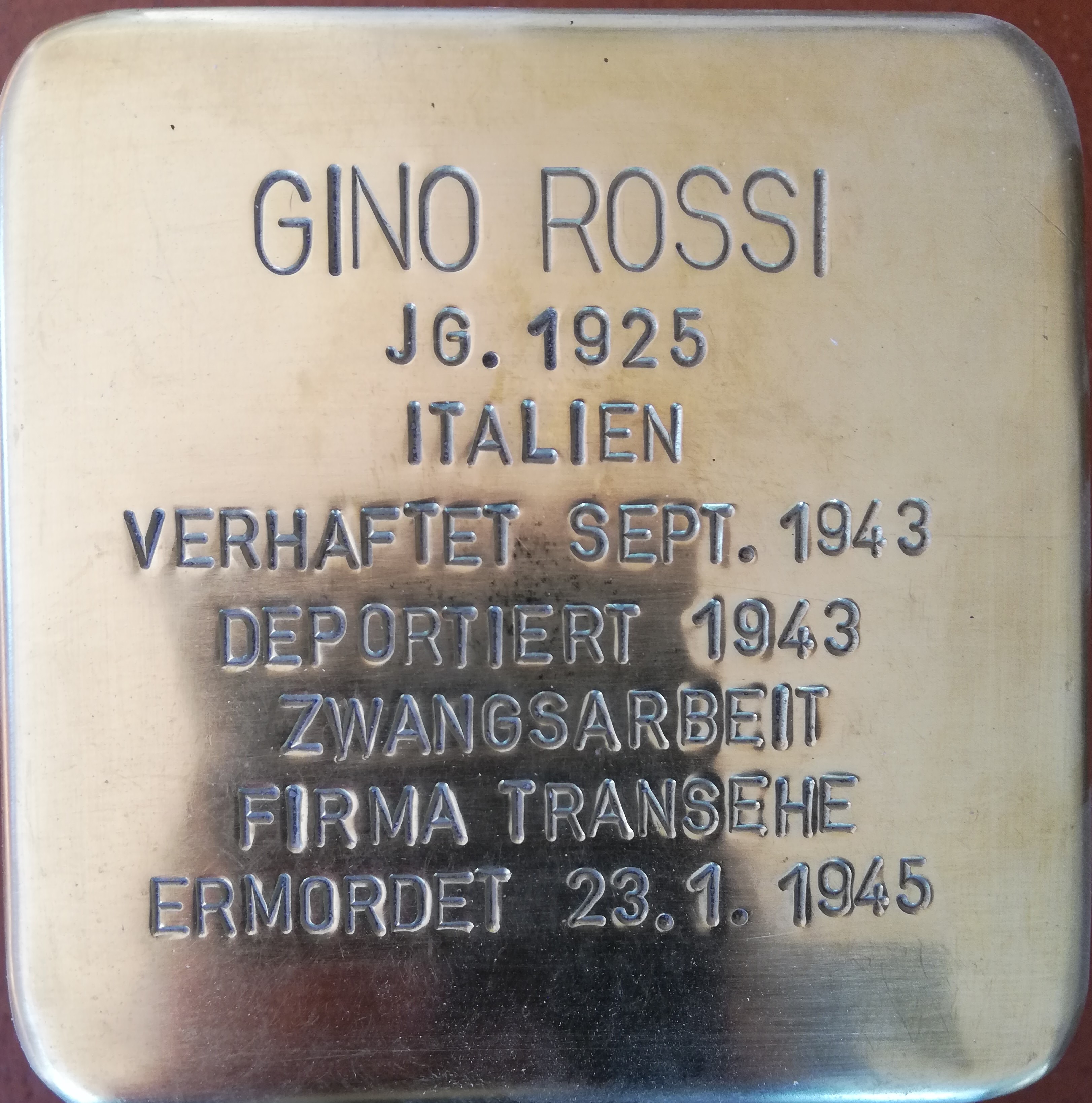 Im Oktober 1943 kommt er vom Stalag VII B Memmingen aus nach Gersthofen und muss dort Zwangsarbeit verrichten.6 Gino Rossi ist zu diesem Zeitpunkt 18 Jahre, sein Bruder Nicola 19 Jahre alt. Insgesamt kommen 15 Personen aus Galluccio nach Gersthofen.7